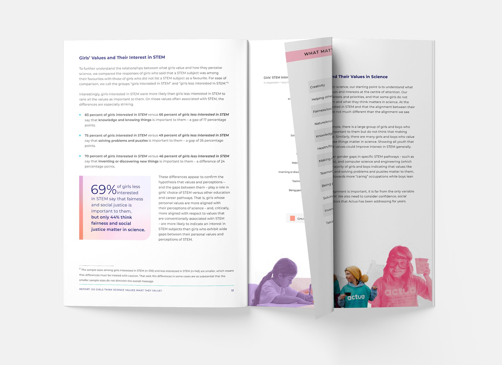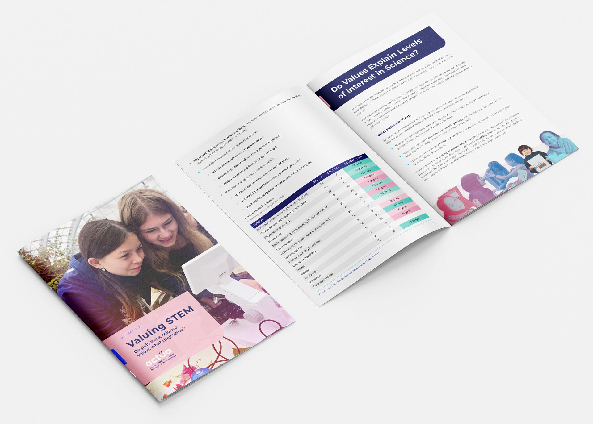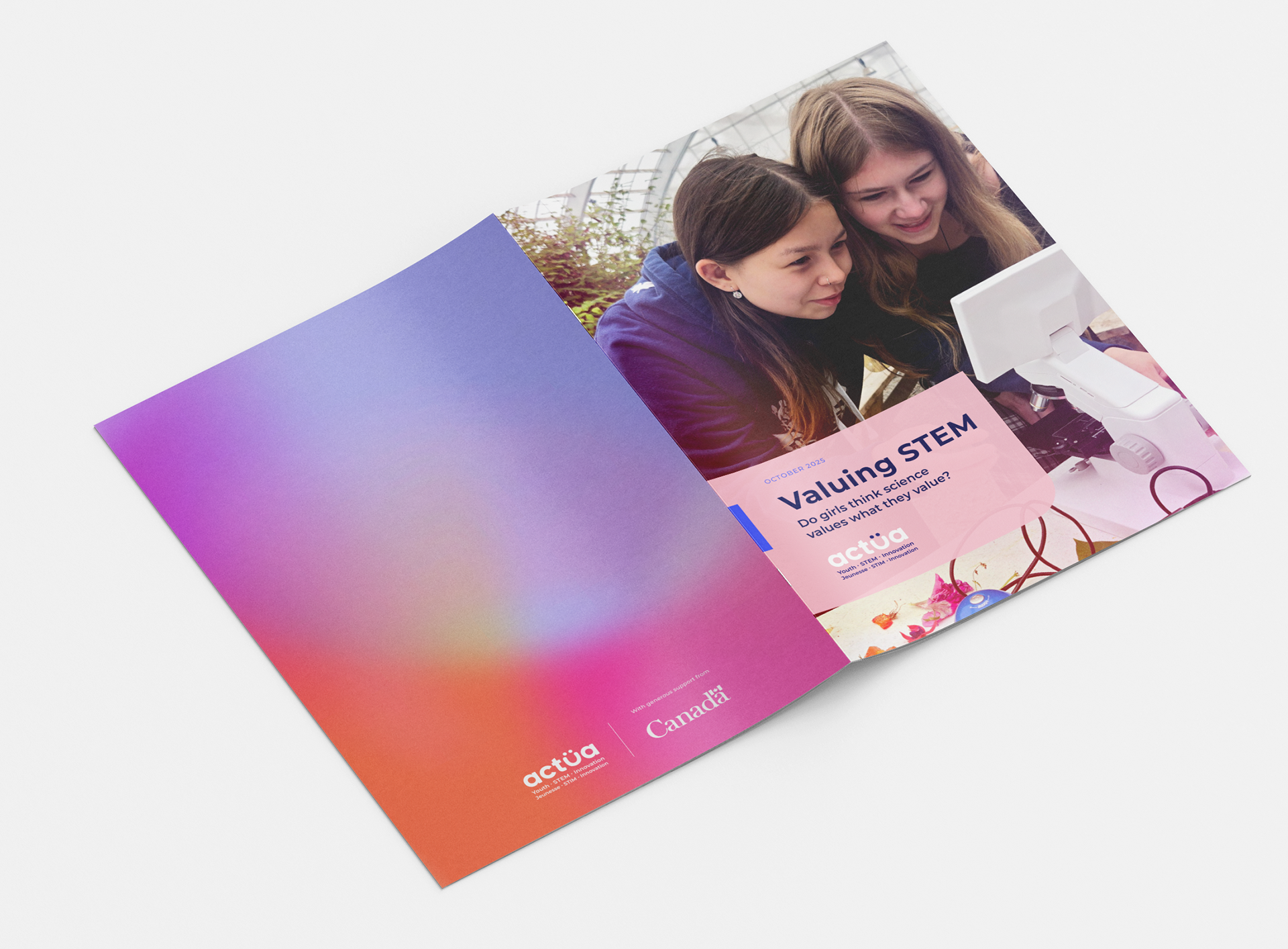 For Actua's "Valuing STEM" campaign, the communication plan highlighted a key finding: girls often leave science because they don't see it connecting to their personal values. Following this strategy, I used Actua's branding and photos to design the report layout and create the visual identity for social media. My goal was to translate the research data into clear materials for educators and parents, while also celebrating the enthusiasm the girls showed during the camps hosted by our network members and partners.