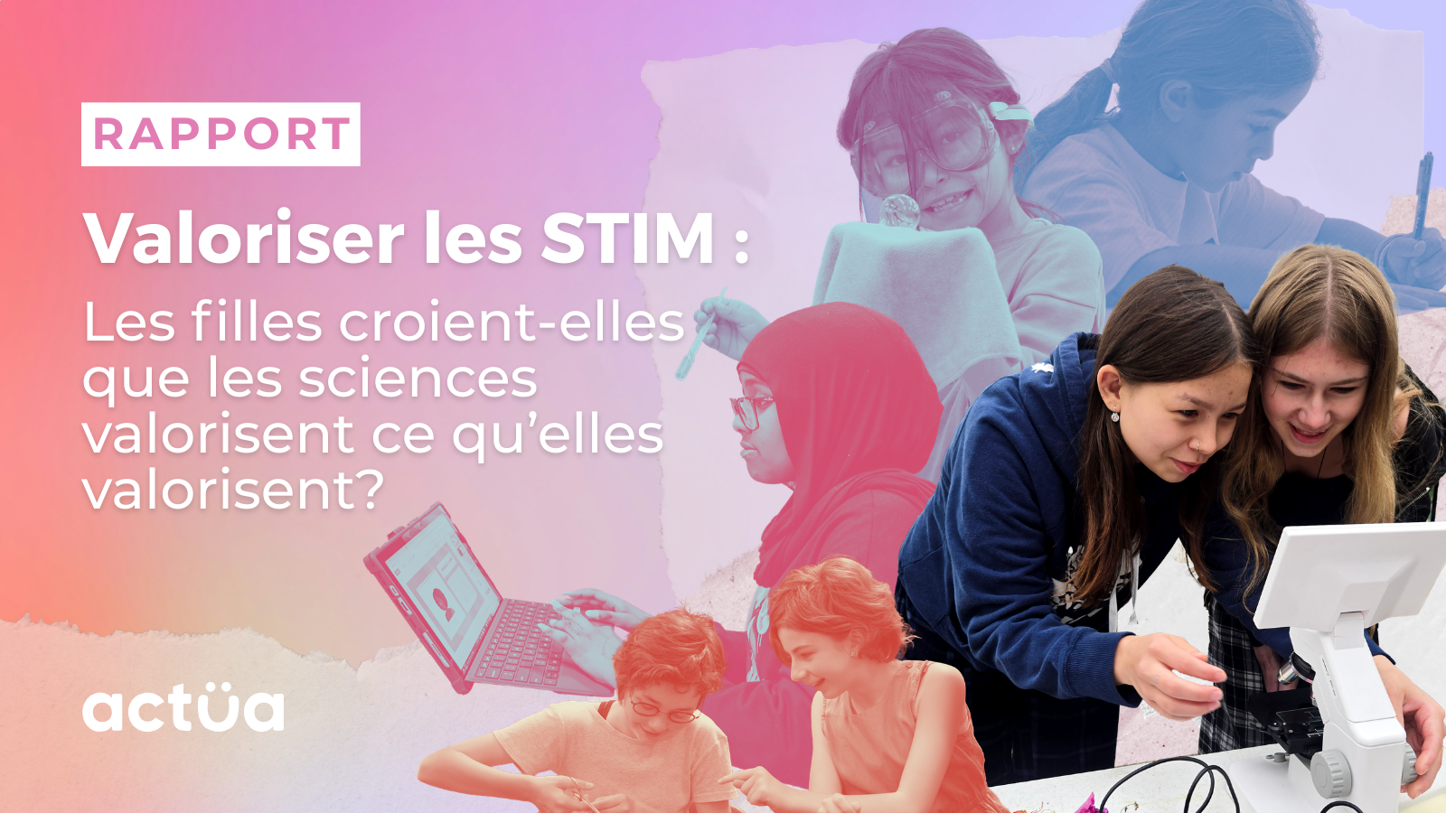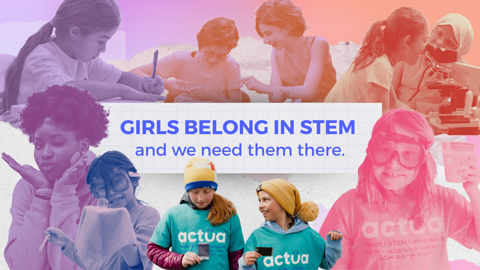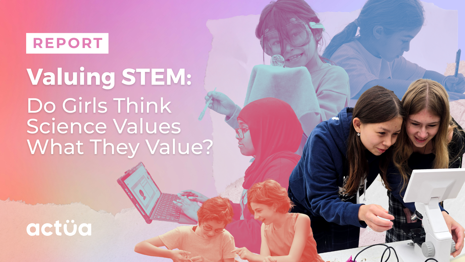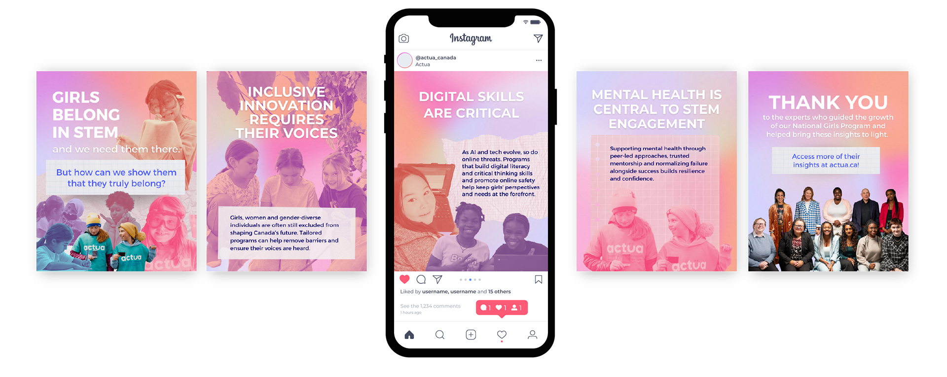 For Actua's "Valuing STEM" campaign, the communication plan highlighted a key finding: girls often leave science because they don't see it connecting to their personal values. Following this strategy, I used Actua's branding and photos to design the report layout and create the visual identity for social media. My goal was to translate the research data into clear materials for educators and parents, while also celebrating the enthusiasm the girls showed during the camps hosted by our network members and partners.